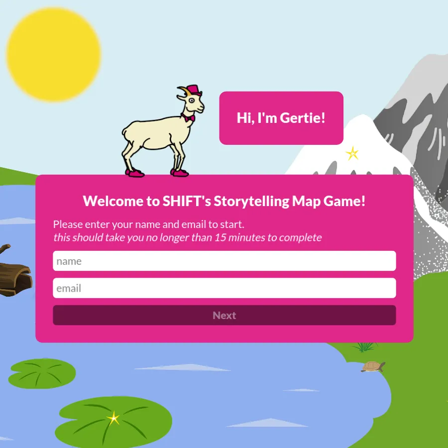 The SHIFT Centre for Social Transformation at Concordia University was looking to create an online version of a storytelling and mapping activity developed for their collaborators. Squinky built them this delightful little game, which features a goat named Gertie traversing a landscape, stopping at multiple points along the way to prompt the player to answer a selection of questions. Sure, you could just use a Google form (and indeed, there is a Google form available for accessibility purposes) but where's the fun in that?