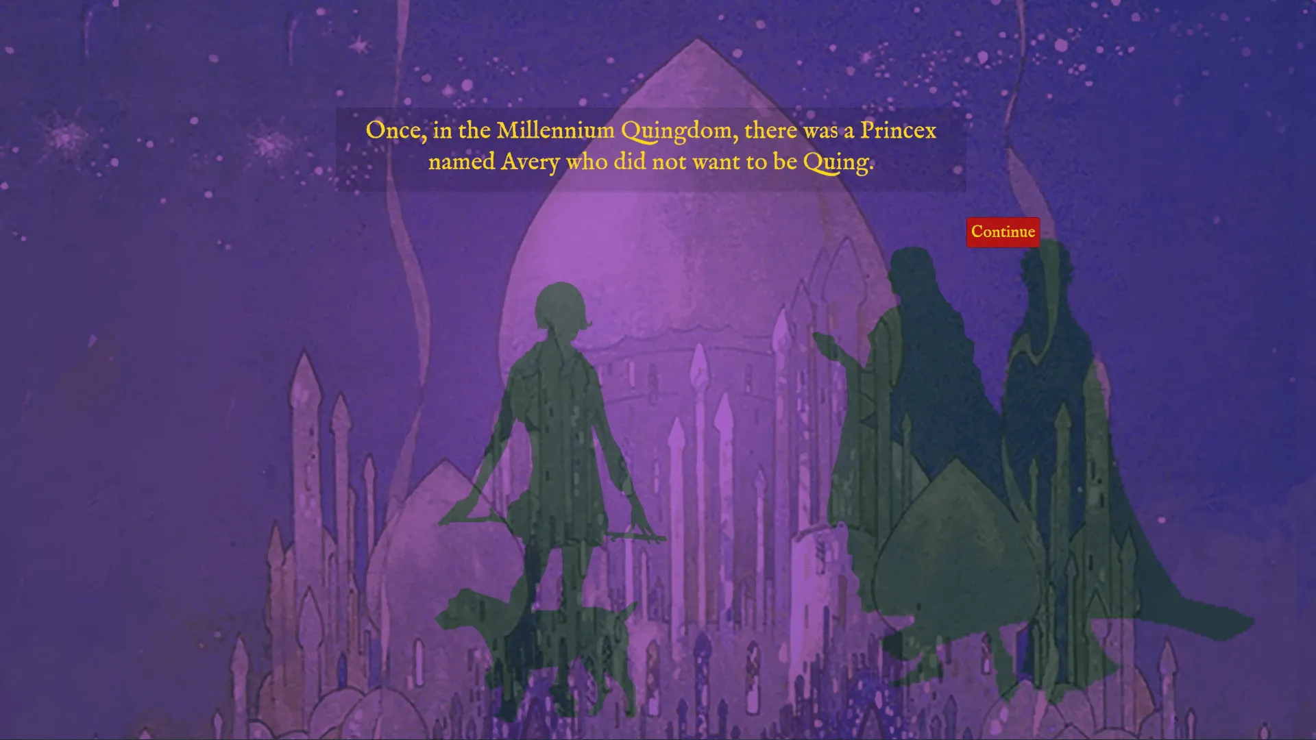 The Fool’s Fairytale est notre contribution à Cartomancy Anthology, une collection d’expériences numériques introspectives représentant chacune l’une des cartes majeures du tarot dans le cadre d’un tirage divinatoire interactif. Dans un style inspiré par le théâtre d’ombres, mêlant les dessins de l’illustratrice d’art nouveau Virginia Frances Sterrett et la musique de Gabriel Fauré, l’histoire vous invite à choisir si Avery, dauphin·e de la couronne malgré ellui, revendiquera son droit divin ou le rejettera pour tracer son propre chemin.